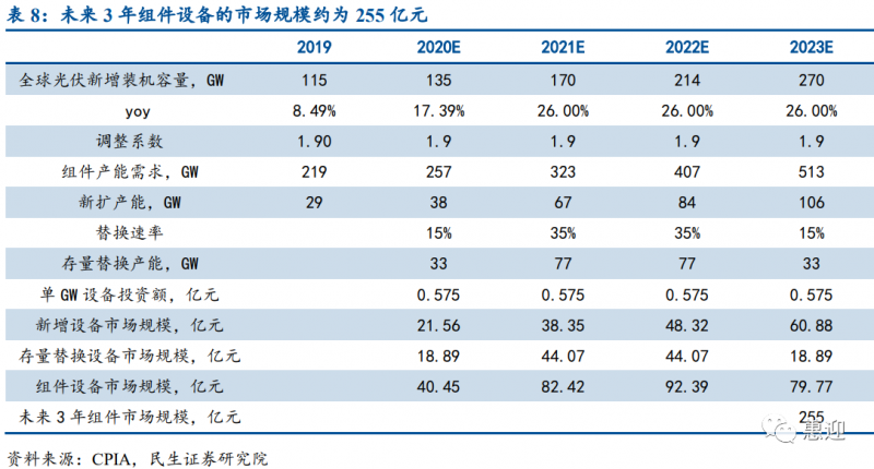 經(jīng)民生證券測算,預(yù)計 2021 年、2022 年、2023 年組件設(shè)備的市場規(guī)模可分別達(dá)到 82.42 億元、92.39 億元和 79.77 億元,未來 3 年組件設(shè)備的市場規(guī)模合計可達(dá) 255 億元,組件設(shè)備廠商擁有廣闊的發(fā)展前景。