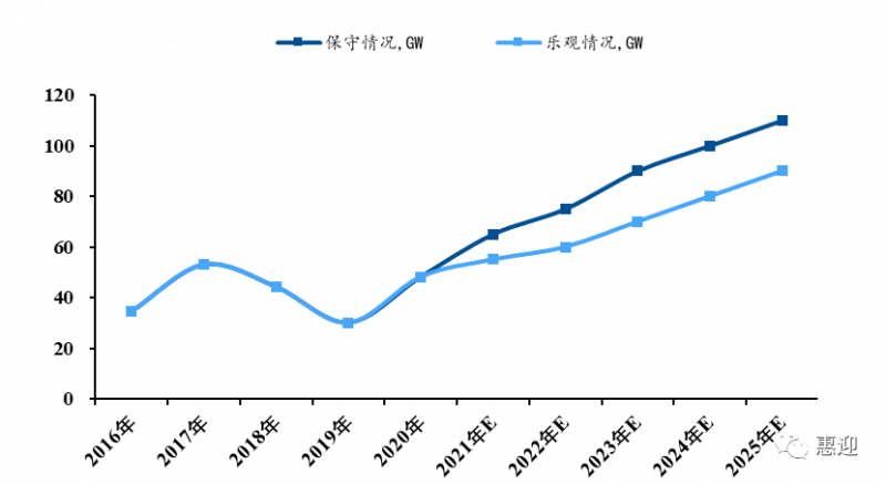 在中國向“30·60目標(biāo)”邁進(jìn)的過程中,“十四五”是實現(xiàn)碳達(dá)峰的關(guān)鍵時期,光伏發(fā)電大有可為。根據(jù) CPIA的觀察與分析,預(yù)計 2021 年新增裝機(jī)規(guī)模約為 55GW-65GW,預(yù)計“十四五”期間,國內(nèi)年均光伏新增裝機(jī)規(guī)模將達(dá) 70-90GW。由此推算,未來 5 年,光伏新增總裝機(jī)規(guī)模有望達(dá)到 350-450GW,同比“十三五”期間 210GW 的新增總裝機(jī)規(guī)模有較大幅度提升。