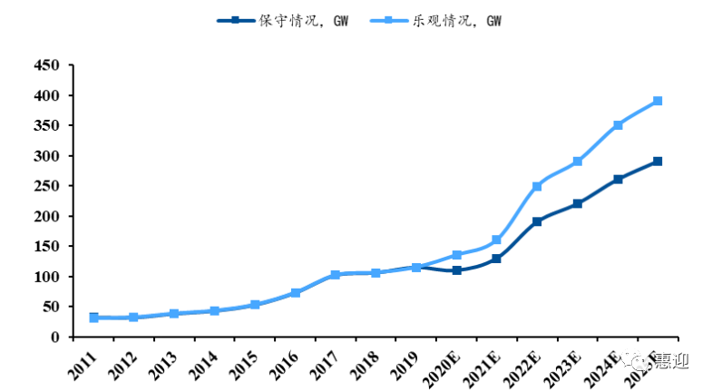 光伏行業(yè)降本提效穩(wěn)步推進(jìn),疊加全球各國可再生能源政策的頒布與執(zhí)行,預(yù)計全球光伏累計裝機(jī)容量將繼續(xù)保持增長態(tài)勢,根據(jù) CPIA 的預(yù)測,“十四五”期間,樂觀預(yù)期下,全球光伏裝機(jī)規(guī)模年均新增 287GW,中性情況下年均新增 222GW。該預(yù)期與 IRENA 于 2019 年年在分析報告《光伏的未來》給出的預(yù)測基本一致,IRENA 認(rèn)為,到 2030 年光伏的裝機(jī)目標(biāo)將達(dá)到 8500GW,年均光伏新增規(guī)模將超過 250GW。