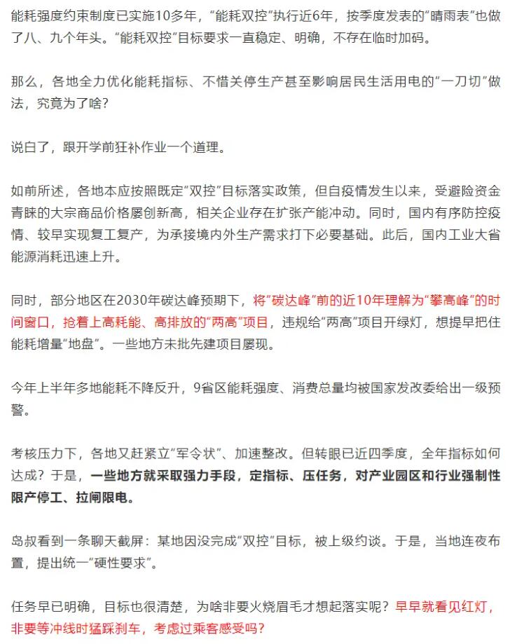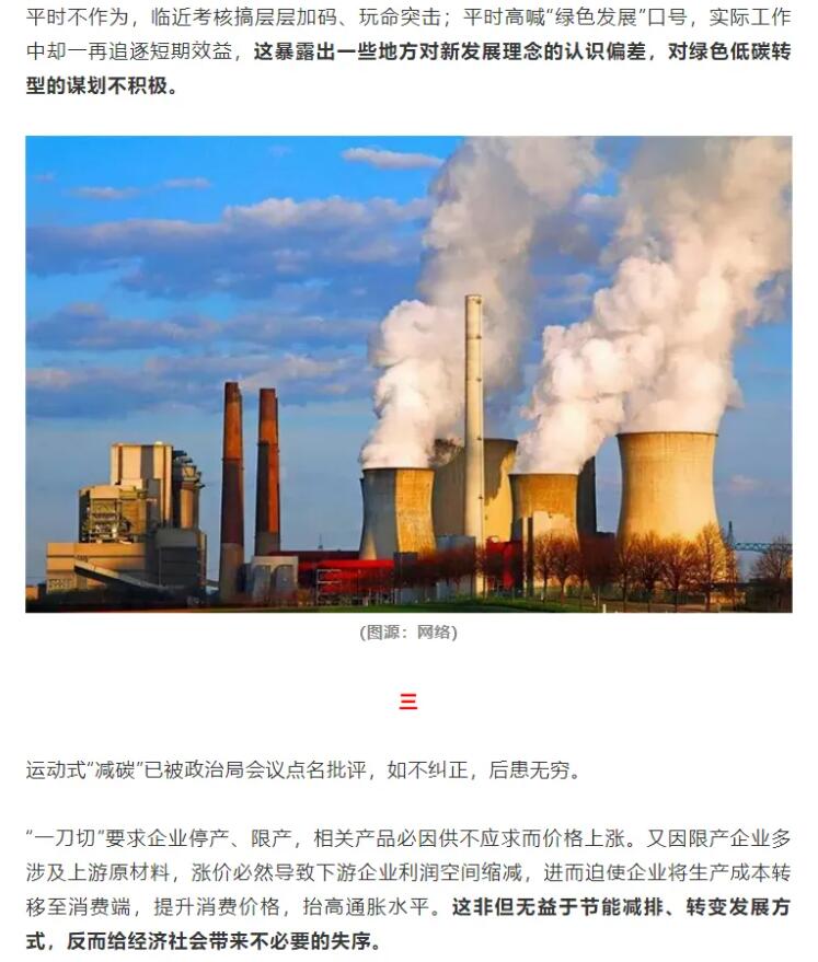 在這一政策的影響下,各地政府層層加碼,許多企業(yè)生產(chǎn)陷入停滯,甚至有部分地區(qū)居民生活用電、用水也受到影響。對(duì)此,人民日?qǐng)?bào)海外版《俠客島》評(píng)論稱,平時(shí)不作為,臨近考核搞層層加碼、玩命突擊;平時(shí)高喊“綠色發(fā)展”口號(hào),實(shí)際工作中卻一再追逐短期效益,這暴露出一些地方對(duì)新發(fā)展理念的認(rèn)識(shí)偏差,對(duì)綠色低碳轉(zhuǎn)型的謀劃不積極,“跟開(kāi)學(xué)前狂補(bǔ)作業(yè)一個(gè)道理。”