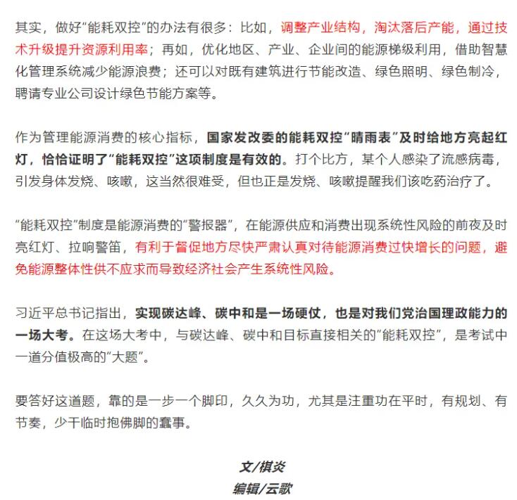 編者按:9月11日,國(guó)家發(fā)展改革委印發(fā)《完善能源消費(fèi)強(qiáng)度和總量雙控制度方案》,要求各地政府以能源資源配置更加合理、利用效率大幅提高為導(dǎo)向,以建立科學(xué)管理制度為手段,以提升基礎(chǔ)能力為支撐,強(qiáng)化和完善能耗雙控制度,深化能源生產(chǎn)和消費(fèi)革命,推進(jìn)能源總量管理、科學(xué)配置、全面節(jié)約,推動(dòng)能源清潔低碳安全高效利用,倒逼產(chǎn)業(yè)結(jié)構(gòu)、能源結(jié)構(gòu)調(diào)整,助力實(shí)現(xiàn)碳達(dá)峰、碳中和目標(biāo),促進(jìn)經(jīng)濟(jì)社會(huì)發(fā)展全面綠色轉(zhuǎn)型和生態(tài)文明建設(shè)實(shí)現(xiàn)新進(jìn)步。