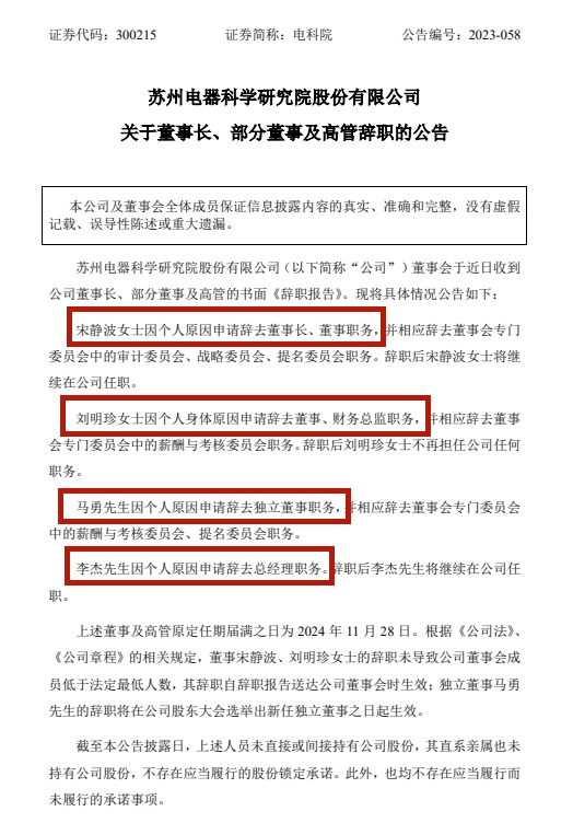 在父子“內(nèi)斗”形勢(shì)明朗,父親胡德霖去世,胡醇及其母成為公司實(shí)際控制人之后,電科院9月1日晚間發(fā)布公告,包括董事長(zhǎng)、總經(jīng)理、財(cái)務(wù)總監(jiān)在內(nèi),多人宣布辭職。