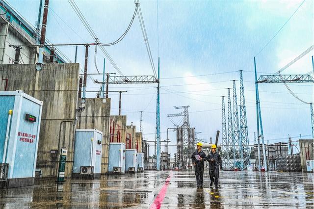 國網(wǎng)河南直流中心運維人員在±800千伏特高壓中州換流站開展暴雨天氣特巡。