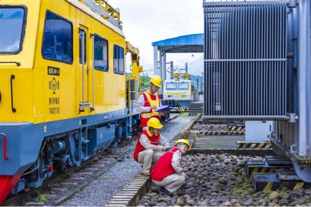 國家電網(wǎng)重慶電力紅巖(長壽園區(qū))共產(chǎn)黨員服務(wù)隊隊員對晏家火車牽引站開展安全用電檢查。