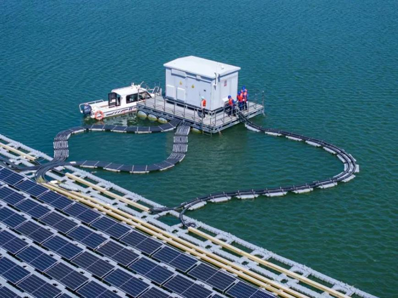 國網(wǎng)山東電力員工在世界單體最大水上漂浮式光伏電站協(xié)助用戶開展設備運行維護。