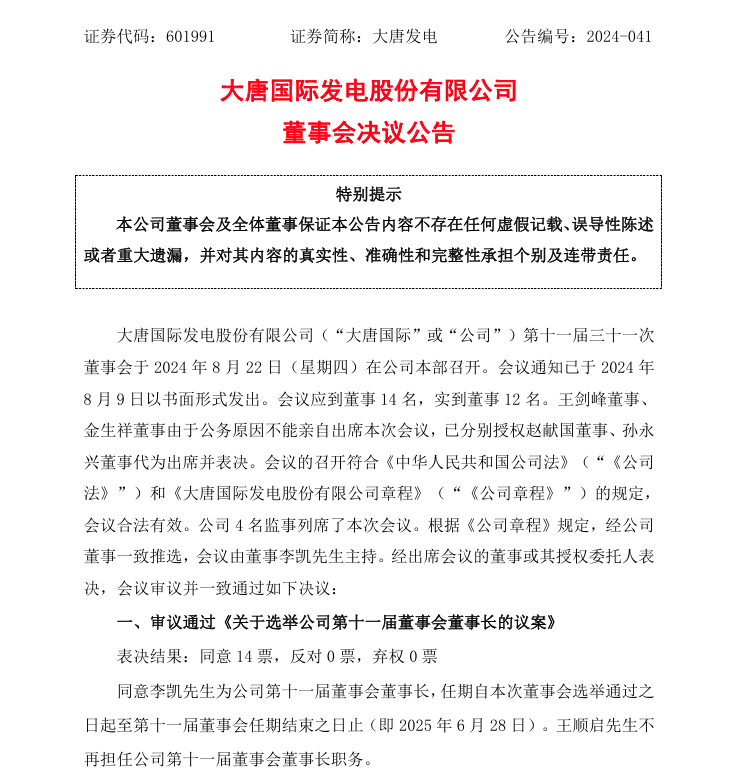8月23日,大唐發(fā)電公告稱,董事會審議通過《關于選舉公司第十一屆董事會董事長的議案》,同意李凱先生為公司第十一屆董事會董事長,任期自本次董事會選舉通過之 日起至第十一屆董事會任期結束之日止(即2025年6月28日)。王順啟先生不再擔任公司第十一屆董事會董事長職務。