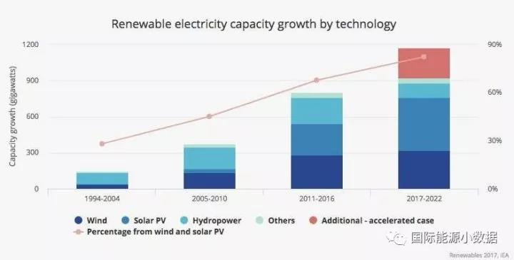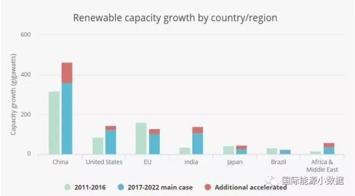 過去對于可再生能源發(fā)展規(guī)模預(yù)測曾經(jīng)偏保守的IEA現(xiàn)在預(yù)測,2017-2022年間全球可再生能源新增裝機將至少達到920吉瓦(其中風電321吉瓦、光伏438吉瓦),其中363吉瓦(39%)將來自中國。如果各國政策支持力度加大的樂觀情形下,2017-2022年間可再生能源新增裝機可能達到1150吉瓦,其中464吉瓦(40%)來自中國。