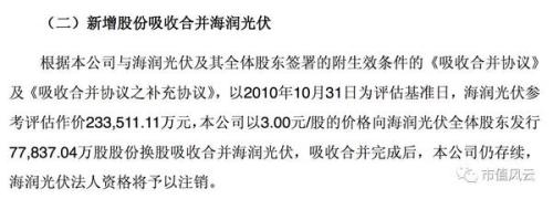 根據(jù)報告書,原海潤光伏2008年、2009年和2010年1~10月實現(xiàn)的凈利潤分別為2.11億、0.26億(據(jù)說是受金融危機(jī)影響)、2.7億,妥妥的優(yōu)質(zhì)資產(chǎn)。