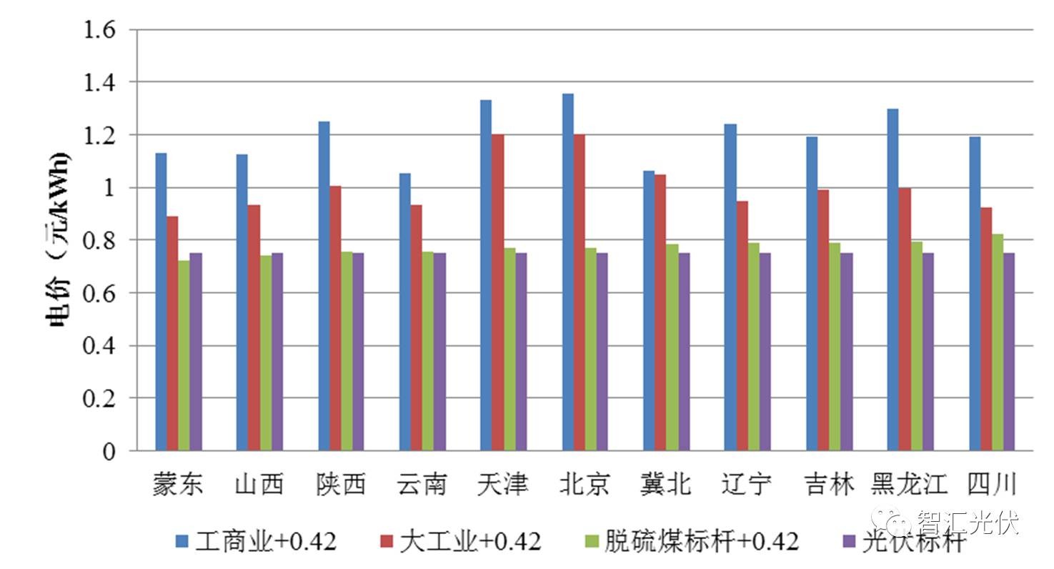 可以看出: “工商業(yè)+0.42”比0.65元/kWh高0.29~0.61元/kWh “大工業(yè)+0.42”比0.65元/kWh高0.14~0.27元/kWh 脫硫煤+0.42”比0.65元/kWh高0.02~0.095元/kWh 即在Ⅰ 類資源區(qū),無論是在工商業(yè)屋頂,還是大工業(yè)屋頂,“自發(fā)自用電價”、“余電上網(wǎng)電價“均高于當(dāng)?shù)氐摹叭~上網(wǎng)”標(biāo)桿電價0.65元/kWh。