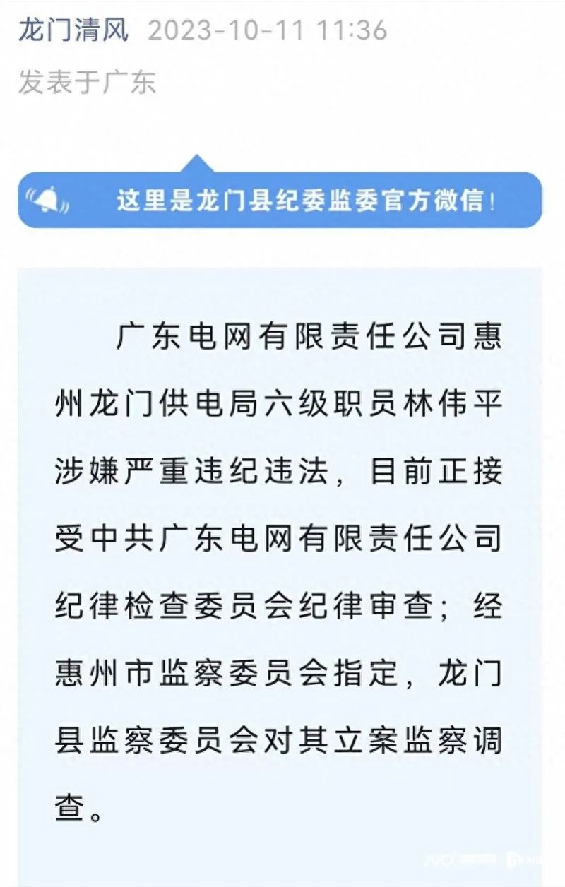 南都訊 記者黃海林 10月11日,惠州市龍門縣紀(jì)委監(jiān)委官方微信“龍門清風(fēng)”發(fā)布消息:廣東電網(wǎng)有限責(zé)任公司惠州龍門供電局黨委委員、副總經(jīng)理、工會主席程水添,廣東電網(wǎng)有限責(zé)任公司惠州龍門供電局六級職員林偉平涉嫌嚴(yán)重違紀(jì)違法,目前正接受中共廣東電網(wǎng)有限責(zé)任公司紀(jì)律檢查委員會紀(jì)律審查;經(jīng)惠州市監(jiān)察委員會指定,龍門縣監(jiān)察委員會對他們立案監(jiān)察調(diào)查。