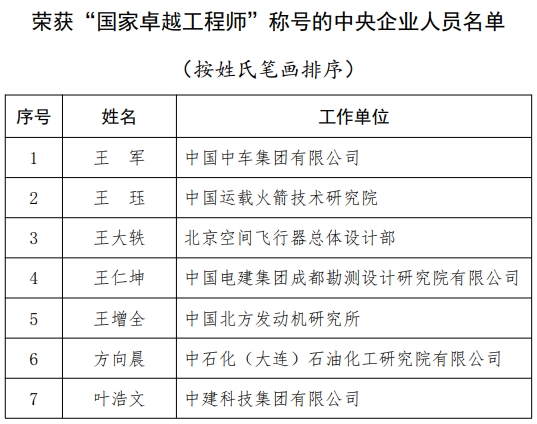 中央企業(yè)共有王軍等29名工程科技人才榮獲“國家卓越工程師”稱號,400萬噸/年煤間接液化成套技術創(chuàng)新開發(fā)及產(chǎn)業(yè)化團隊等20個團隊榮獲“國家卓越工程師團隊”稱號。
