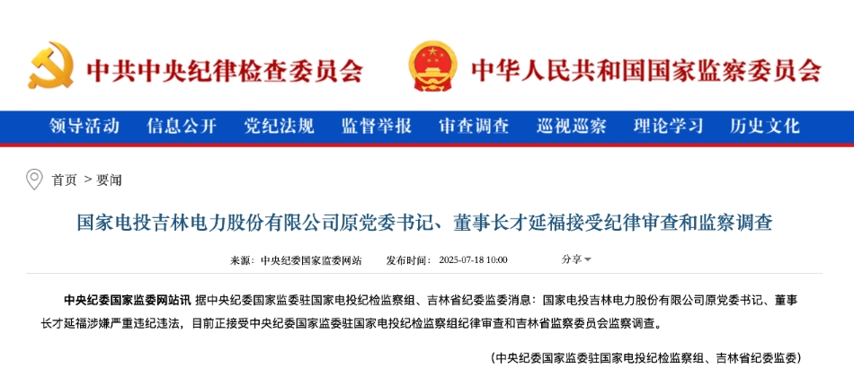 中央紀委國家監(jiān)委網站7月18日消息,據(jù)中央紀委國家監(jiān)委駐國家電投紀檢監(jiān)察組、吉林省紀委監(jiān)委消息:國家電投吉林電力股份有限公司原黨委書記、董事長才延福涉嫌嚴重違紀違法,目前正接受中央紀委國家監(jiān)委駐國家電投紀檢監(jiān)察組紀律審查和吉林省監(jiān)察委員會監(jiān)察調查。
