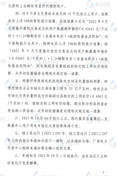 廣西發(fā)布《自治區(qū)工業(yè)和信息化廳關(guān)于進(jìn)一步調(diào)整2021年全區(qū)電力市場(chǎng)化交易方案的緊急通知》,在緊急通知中,高耗能企業(yè)電價(jià)直接上浮50%進(jìn)行結(jié)算。