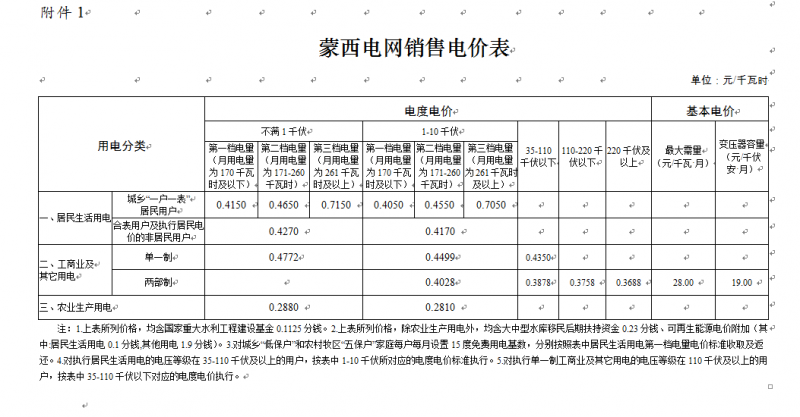 內(nèi)蒙古發(fā)改委提出《關(guān)于明確蒙西地區(qū)電力市場(chǎng)交易用戶保底電價(jià)的通知》中的保底電價(jià)比原有電價(jià)上浮了80%。蒙西的新保底電價(jià)如下表所示