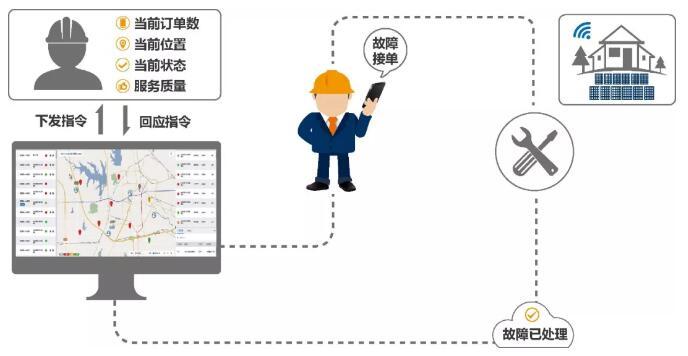 運維方面,從成本角度考慮,村級扶貧電站不適合派人長期駐守運維,故障的及時發(fā)現(xiàn)、分析、解決需要制定靈活高效的運維方案。光伏行業(yè)先進企業(yè)通過現(xiàn)代化物聯(lián)網(wǎng)技術(shù)、人工智能及大數(shù)據(jù)分析技術(shù),為光伏電站打造智慧大腦,實現(xiàn)電站實時監(jiān)測、智能分析和診斷、快速定位。此次示例設(shè)計方案中將電站接入智慧能源扶貧平臺,在實現(xiàn)以上功能基礎(chǔ)之外,增加智能派單功能,實現(xiàn)及時消缺,使得村級扶貧電站的運維更加高效。