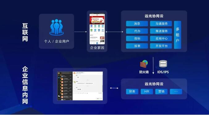 遠(yuǎn)光“企業(yè)家園”采用公有云與私有云共存的混合云架構(gòu),即對(duì)于企業(yè)商密等級(jí)較低的數(shù)據(jù),如消息提醒、待辦提醒等可以通過(guò)移動(dòng)端在外網(wǎng)進(jìn)行實(shí)時(shí)訪問(wèn),對(duì)于企業(yè)內(nèi)部數(shù)據(jù)、商密等級(jí)高的數(shù)據(jù),依然保留在本地,通過(guò)企業(yè)電腦端才能訪問(wèn)。充分利用互聯(lián)網(wǎng)應(yīng)用的靈活性、便利性的同時(shí),保證數(shù)據(jù)的安全性、私密性。