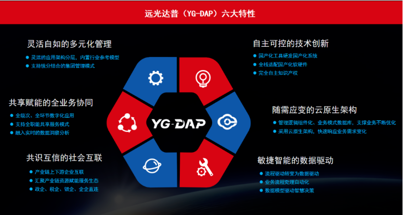 遠(yuǎn)光DAP是遠(yuǎn)光軟件以“助力企業(yè)數(shù)字化轉(zhuǎn)型升級”為目標(biāo)研發(fā)推出的新一代企業(yè)數(shù)字核心應(yīng)用系統(tǒng),采用“云原生”技術(shù),按照“全棧國產(chǎn)化、組件式接入、全業(yè)務(wù)協(xié)同、嵌入型分析、服務(wù)化運營”的設(shè)計理念,建設(shè)“戰(zhàn)略規(guī)劃、資源管理、生產(chǎn)經(jīng)營、共享服務(wù)、數(shù)據(jù)運營”五大核心應(yīng)用,以數(shù)據(jù)驅(qū)動業(yè)務(wù)管理,以智能支撐戰(zhàn)略決策,促進(jìn)產(chǎn)業(yè)互聯(lián)、社會互聯(lián)生態(tài)構(gòu)建。