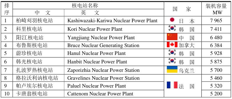 世界上最大的核電站是日本柏崎刈羽核電站,裝機(jī)容量為7965MW,但2011年已經(jīng)停工。值得注意的是韓國(guó)核電站進(jìn)展很快,前十位核電站就占有3席,把美國(guó)和日本都摔到后面。