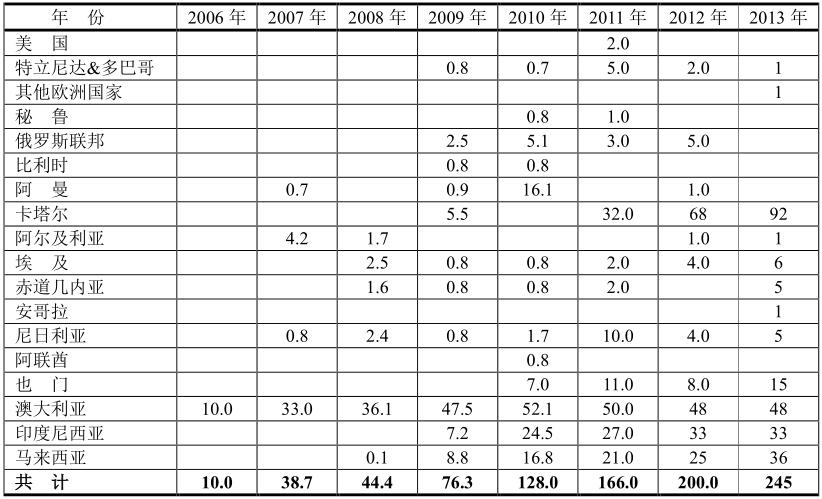2006~2013年中國LNG進口量(億立方米/108m3)