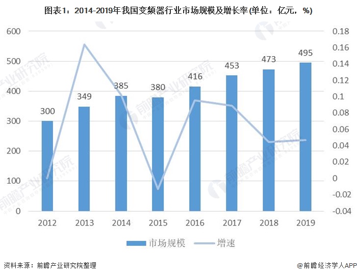我國變頻器行業(yè)的市場規(guī)模整體呈上升態(tài)勢(shì),從2012年至2019年,中國變頻器行業(yè)規(guī)模除2015年有小幅度下降以外,其余年份均處于穩(wěn)步增長狀態(tài)。2019年我國變頻器行業(yè)的市場規(guī)模達(dá)到495億元,相比2018年增長4.7%。