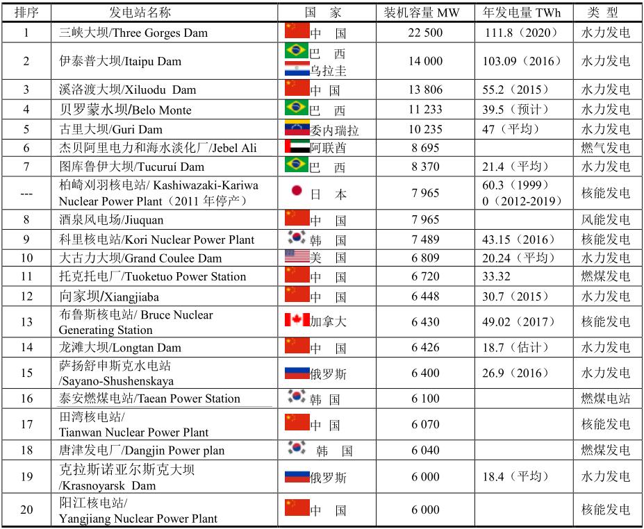 全球前20位發(fā)電站的順序是隨著時間而變化的,下表是最新的排序。目前全球20席中,中國占有八席:水力發(fā)電占有4席:三峽大壩、溪洛渡大壩、向家壩和龍灘大壩;燃煤發(fā)電占一席:托克托電廠;核能發(fā)電占一席:陽江核電站。
