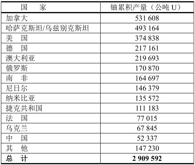 本數(shù)據(jù)是世界核能協(xié)會(WNA)于 2020年12月份提供的從鈾礦生產(chǎn)(公噸U)的數(shù)據(jù)。
