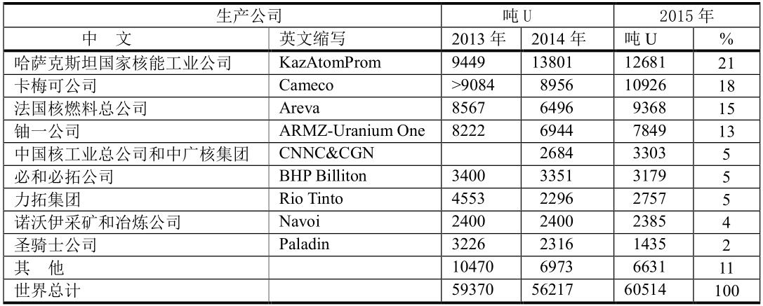 2013~2015年世界鈾生產(chǎn)主要公司