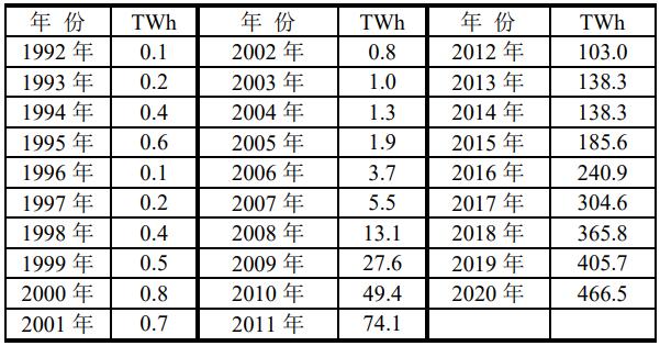 中國風(fēng)電場發(fā)電量進程(單位:TWh)