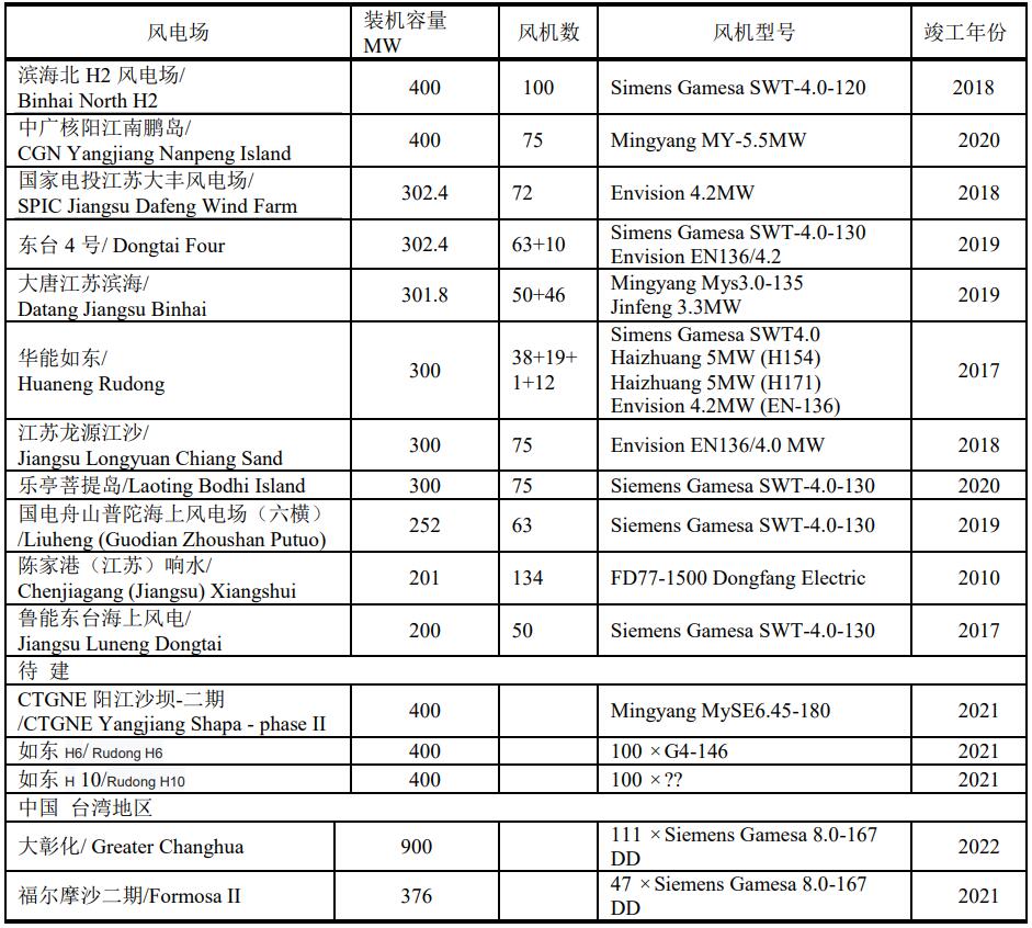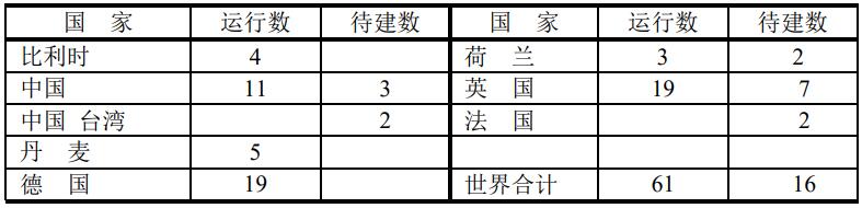 目前全球裝機容量大于200 MW的海上風(fēng)電場有61個風(fēng)電場在運行,待建的海上風(fēng)電場有16座。目前海上風(fēng)電場主要在西歐國家,如德國和英國。