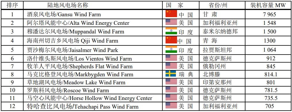 全球最大的前12大的陸上風(fēng)電場,美國最多,占7座。盡管中國風(fēng)力發(fā)電量居全球之首,僅占2座。