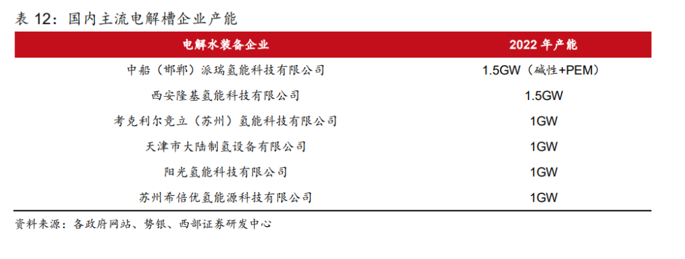電解水制氫是指水分子在直流電作用下被解離生成氧氣和氫氣,分別從電解槽陽極和陰極 析出。根據(jù)工作原理和電解質(zhì)的不同,電解水制氫技術(shù)通常分為四種,分別是堿性電解水 技術(shù)(ALK)、質(zhì)子交換膜電解水技術(shù)(PEM)、高溫固體氧化物電解水技術(shù)(SOEC)和 固體聚合物陰離子交換膜電解水技術(shù)(AEM)。 電解水制氫技術(shù)以堿性電解為主,PEM 電解次之。“雙碳”目標(biāo)提出后,國內(nèi)電解水制氫 項(xiàng)目規(guī)劃和推進(jìn)逐步加快,2022 年國內(nèi)堿性電解槽企業(yè)已披露產(chǎn)能接近 11GW,堿性電 解水制氫技術(shù)已完成商業(yè)化進(jìn)程,產(chǎn)業(yè)鏈發(fā)展成熟,且具備成本優(yōu)勢,已實(shí)現(xiàn)大規(guī)模應(yīng)用; PEM 電解水技術(shù)則處于商業(yè)化初期,產(chǎn)業(yè)鏈國產(chǎn)化程度不足,電解槽雙極板、膜材料以及 鉑、銥等貴金屬催化劑材料成本更高且極度依賴進(jìn)口;高溫固體氧化物電解水技術(shù)和固體 聚合物陰離子交換膜電解水技術(shù)還處于研發(fā)示范階段,未實(shí)現(xiàn)商業(yè)化應(yīng)用。