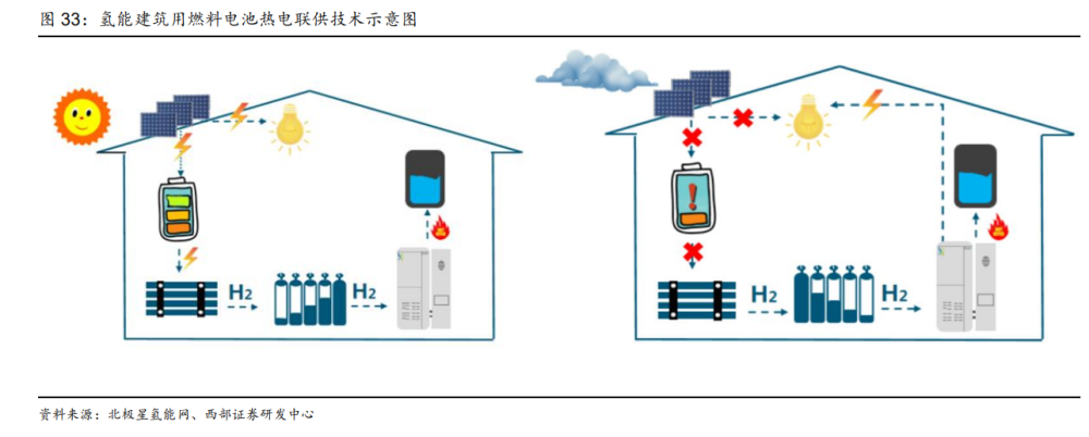 氫建筑應用仍處于導入階段,未來存在較大市場空間。氫能建筑,是近年發(fā)展起來的一種綠色建筑新理念。它以氫能完全或部分替代市政電網(wǎng)、天然氣等傳統(tǒng)能源,滿足建筑對冷、 熱、電、生活熱水等各種能源的需求,在提高建筑用電可靠性的同時,還有助于優(yōu)化國內 的能源結構、降低電網(wǎng)整體投資和減少問題氣體排放。 目前全球建筑供熱和電力需求約占全球能源需求的 1/3。全球多個國家積極探索氫能在建 筑領域應用,利用氫氣通過發(fā)電、直接燃燒、熱電聯(lián)產(chǎn)(CHP)等形式為居民住宅或商業(yè) 區(qū)提供電熱水冷多聯(lián)供。如氫可與天然氣混合(氫氣摻混比例為 0~20%),通過基于燃氣 輪機或燃料電池的 CHP 技術,利用現(xiàn)有建筑和能源網(wǎng)絡基礎設施提供靈活性和連續(xù)性的 熱能、電力供應,從而取代化石燃料 CHP。此外,100% 的純氫可通過氫鍋爐用于建筑 供熱,但氫氣價格需低至 1.5~3.0 美元/kg 時,才能與天然氣鍋爐和電動熱泵競爭。而對 于分布式供暖,氫能是少數(shù)幾種可以與天然氣競爭的低碳替代品,隨著制氫成本和氫鍋爐、 燃料電池成本的下降,以及氫氣利用現(xiàn)有天然氣管道輸送能力的提升,預計到 2030 年, CHP 中氫鍋爐與氫燃料電池的成本為 900~2000 美元/(戶·年),建筑熱電聯(lián)供的氫能 需求量為 3 萬~ 9 萬 t/年。