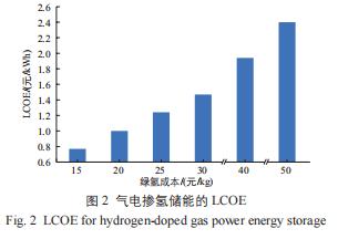 按1 臺容量為50 萬kW 的燃?xì)鈾C(jī)組100%摻氫計算,燃?xì)怆娬就顿Y單價為2600 元/kW,增加儲氣設(shè)施的投資為3000 萬元,年利用小時數(shù)為3000 h,運(yùn)行周期為20 年,固定資產(chǎn)殘值為10%。按等熱值換算后的燒氫量為7 萬t/ 年,發(fā)電量為15 億kWh,計算得到不同綠氫成本對應(yīng)的氣電摻氫儲能的LCOE,具體如圖2 所示。